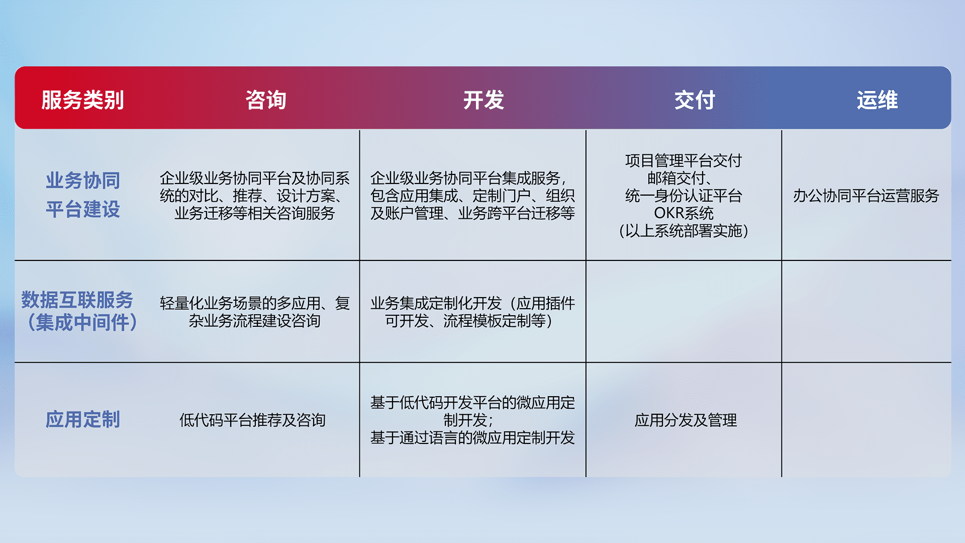 针对钉钉、、、企微、、、、IDaas等平台级产品提供产品的规划、、、、方案、、交付、、、定制化开发等服务,,实现如统一协同办公、、、、智能客户服务、、、混合会议管理、、、智能数据查询、、、、等业务场景,,,,实现数字化转型。。。。